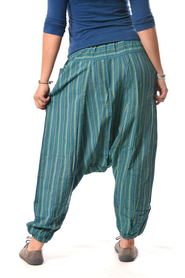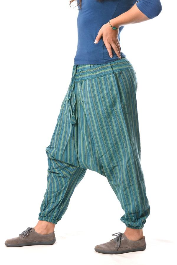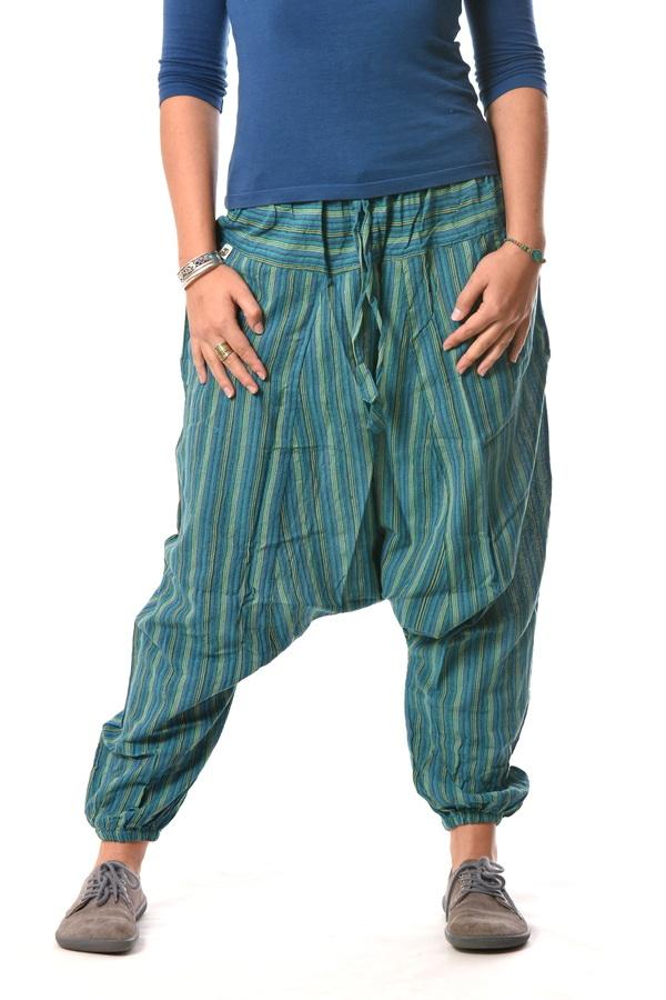 UNISEX etno aladinky sú vyrobené zo 100% bavlny. Sú voľného strihu so sníženým pudlom. Vďaka strečovému pásu sú univerzálnej veľkosti. Ozdobené sú výrazným pásikavým printom. Aladinky disponujú sťahovacím patentom na členkoch a dvoma vreckami. Dĺžka 103 cm.