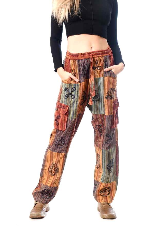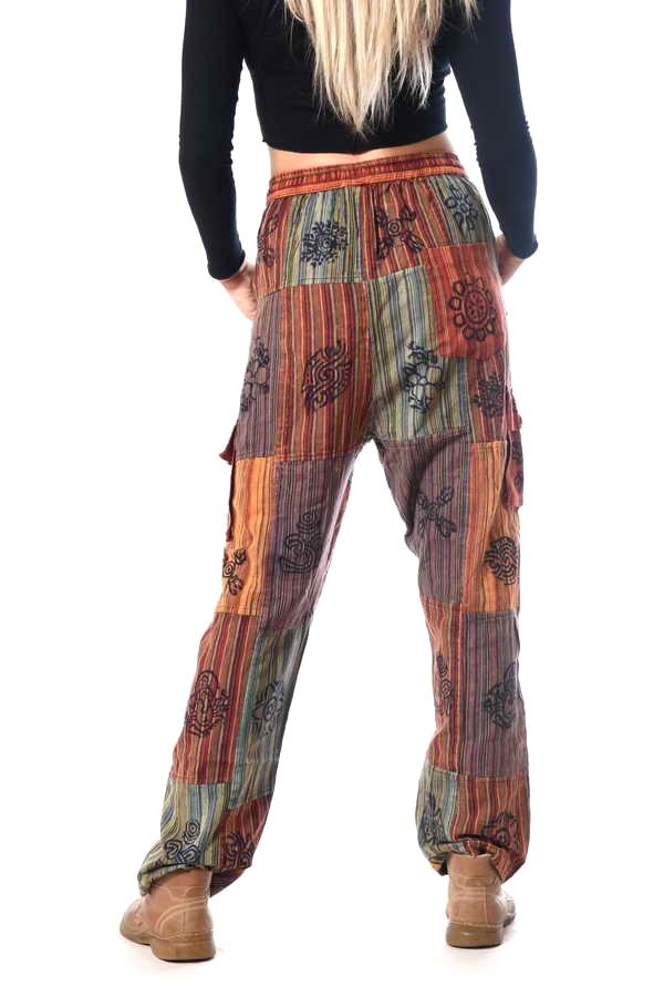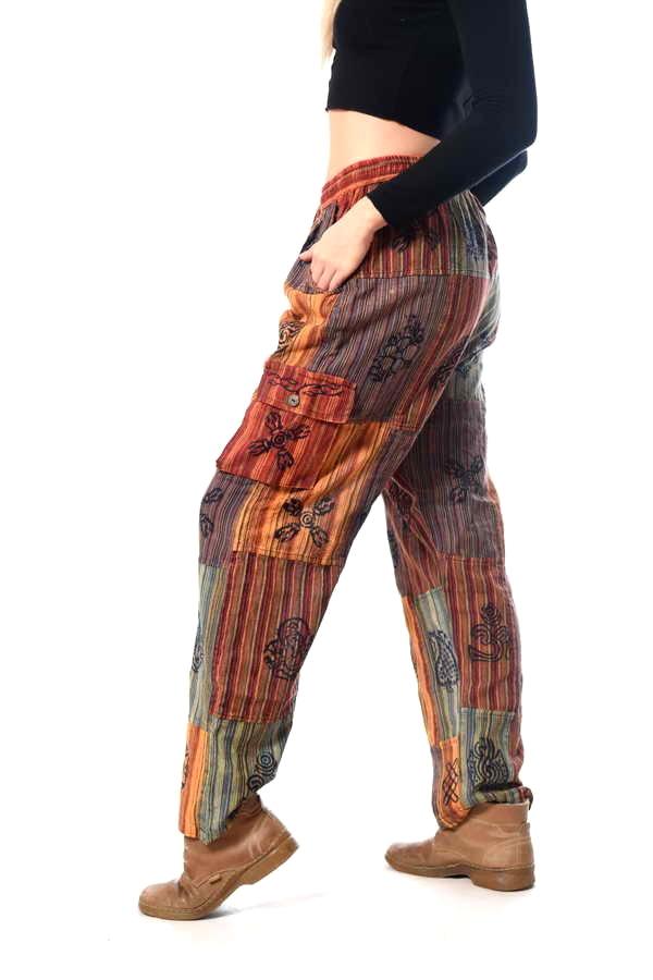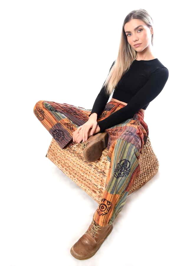 Dámske etno nohavice s voľným strihom a originálnym patchwork vzorom. V páse majú elastickú gumu aj šnúrku, takže sa perfektne prispôsobia postave. Sú vybavené dvomi klasickými vreckami a dvomi stehennými vreckami na gombík, ideálne na praktické nosenie. Ľahký, príjemný materiál a pohodlný štýl ich robia skvelou voľbou na voľný čas, cestovanie aj festivaly. Páči sa ti farebný a originálny dizajn? Pozri si aj naše ruksaky a mikiny.