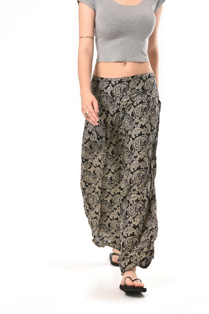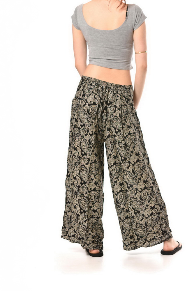 Sukňové viskózové boho nohavice mega širokého strihu, ktorý dokáže napodobniť sukňový vzhľad. Nohavice disponujú vreckom so zapínaním na gombík a majú čiastočne strečový pás so širokou gumou bez zapínania. Tieto vzdušné a ľahučké letné nohavice sú vhodné do letného počasia, na relax aj do spoločnosti. Nohavicová sukňa je ozdobená celoplošnou potlačou. Dĺžka: 97cm.