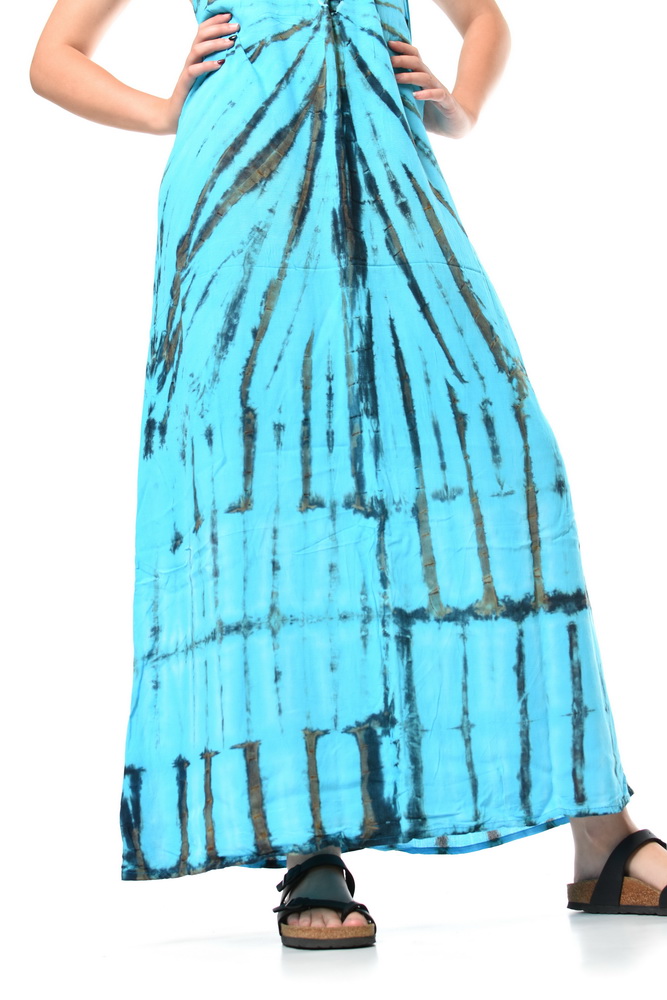 Dlhé batikované šaty s tenkými ramienkami so zaväzovaním okolo krku, alebo okolo pásu. Viskózové šaty zo vzdušného materiálu sú perfektné na leto. Originálny asymetrický strih a ručná batika dotvárajú unikátny boho dizajn. Ramienka sa viažu a tým sa upravuje dĺžka šiat.