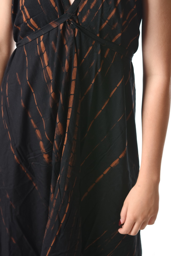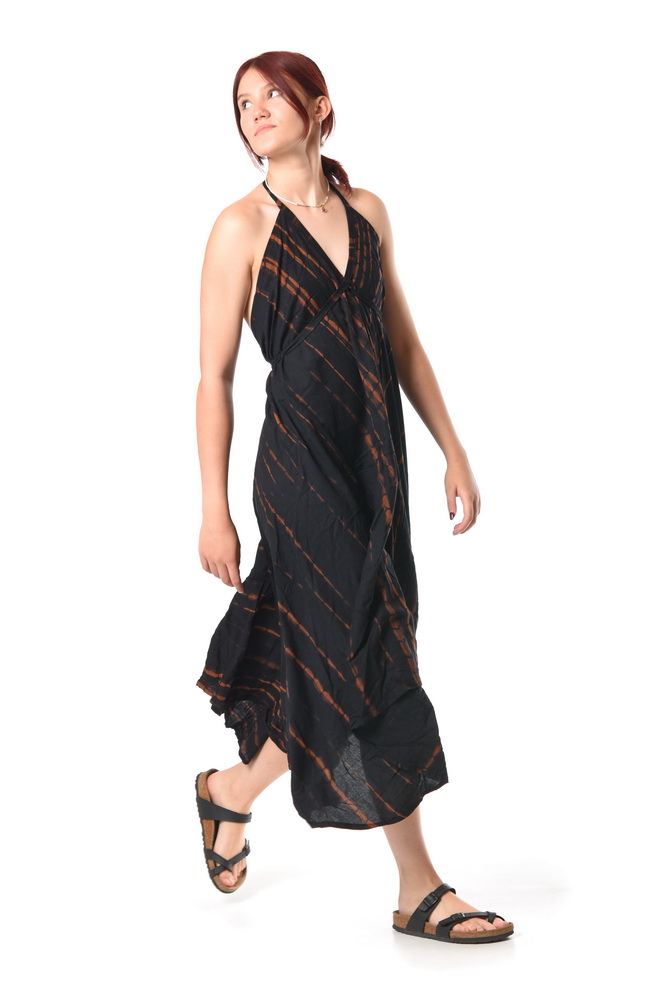 Dlhé batikované šaty s tenkými ramienkami so zaväzovaním okolo krku, alebo okolo pásu. Viskózové šaty zo vzdušného materiálu sú perfektné na leto. Originálny asymetrický strih a ručná batika dotvárajú unikátny boho dizajn. Ramienka sa viažu a tým sa upravuje dĺžka šiat.