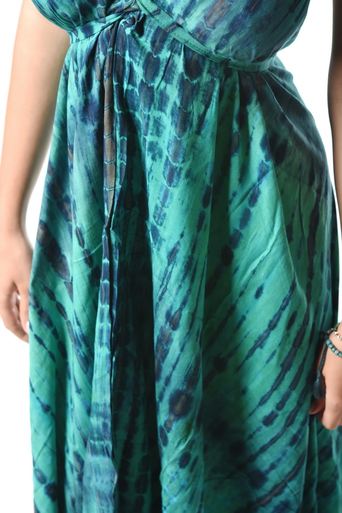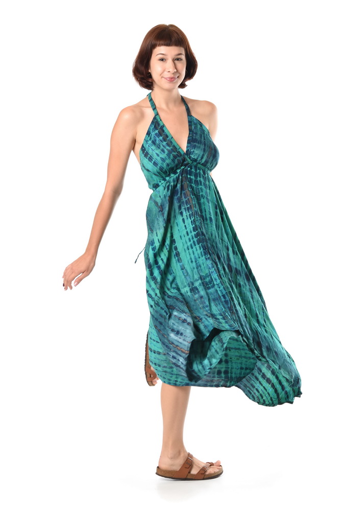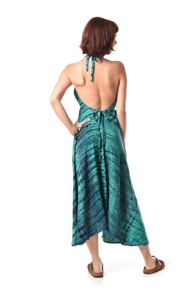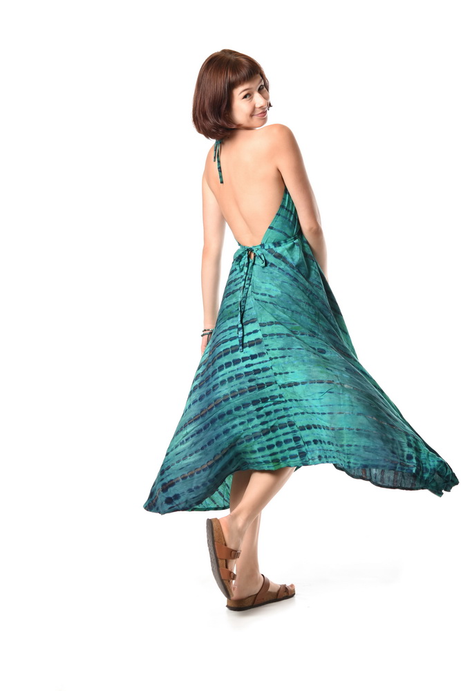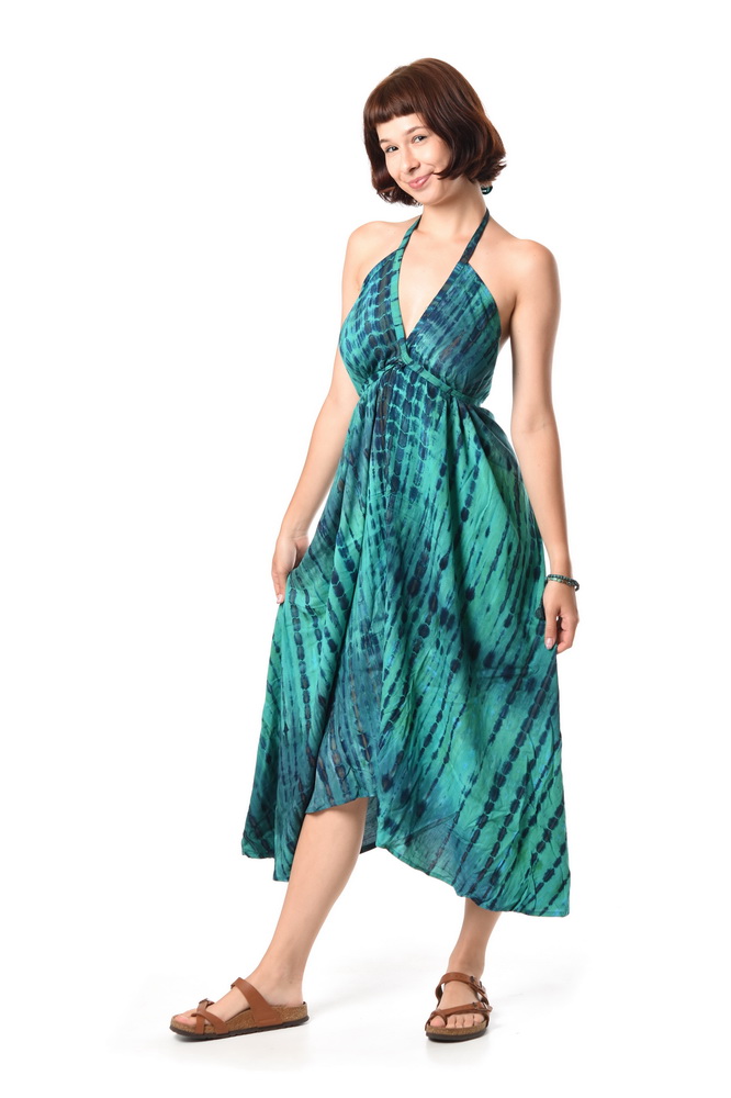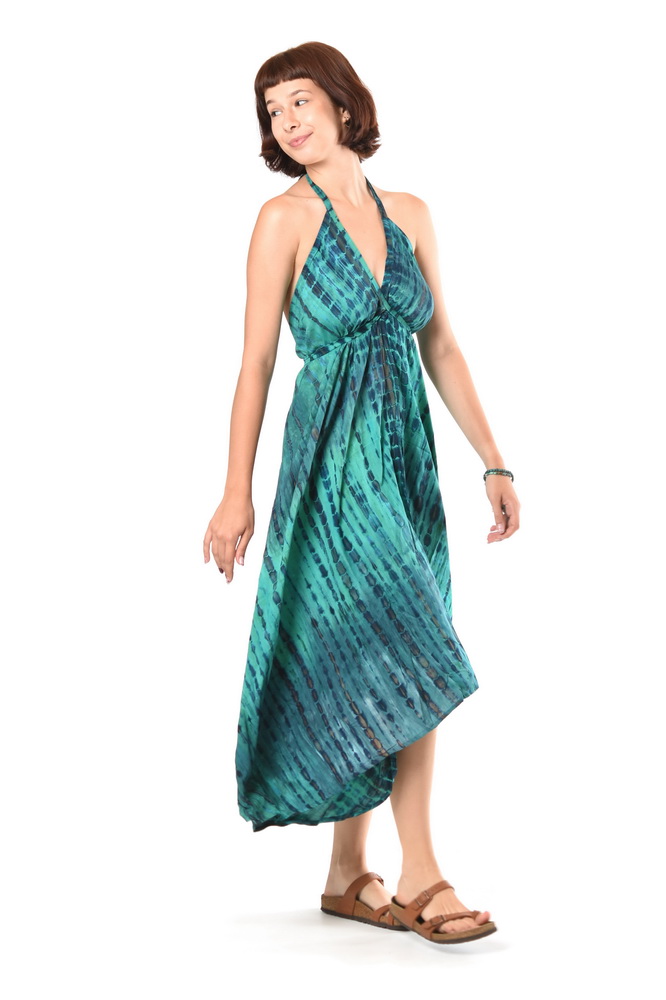 Dlhé batikované šaty s tenkými ramienkami so zaväzovaním okolo krku, alebo okolo pásu. Viskózové šaty zo vzdušného materiálu sú perfektné na leto. Originálny asymetrický strih a ručná batika dotvárajú unikátny boho dizajn. Ramienka sa viažu a tým sa upravuje dĺžka šiat.