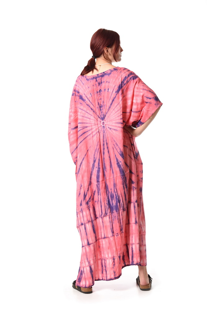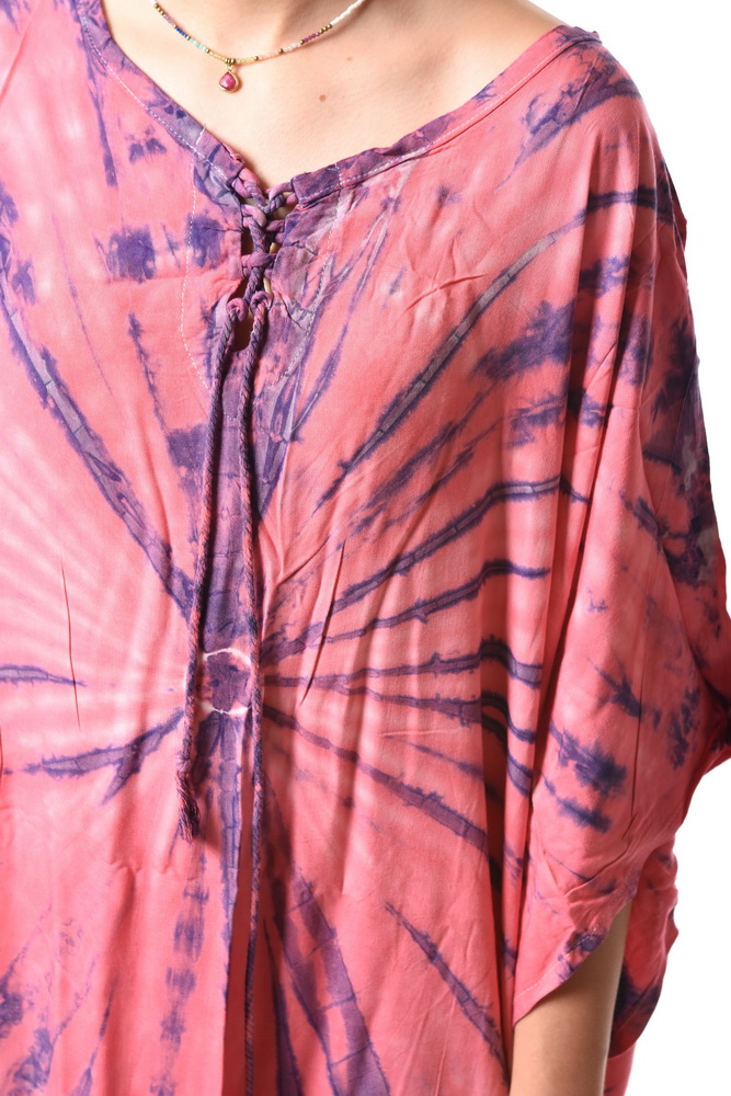 Jedinečné boho kaftanové šaty vynikajú voľným a pohodlným strihom po zem. Bavlnené kaftanové šaty s véčkovým výstrihom a krátkymi rukávmi. Boho maxi tunika je celoplošne batikovaná. Zabaľte sa do obláčika a užívajte leto v záhrade alebo na dovolenke. Dĺžka: 139cm.