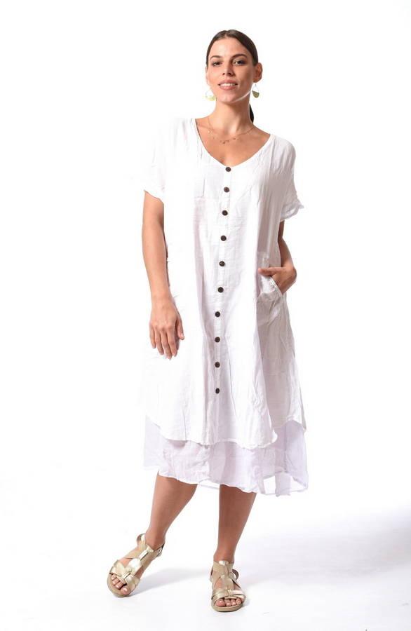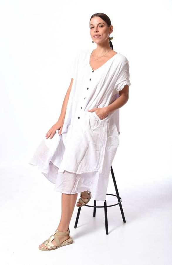 Prevzdušnené tričkové boho šaty s ozdobnými gombíkmi vyrobené z čistej bavlny. Jednofarebné boho šaty s padnutými krátkymi rukávmi sú celoplošne podšité jemnou látkou pre príjemný pocit na koži. Boho šaty majú extra široký, voľný a pohodlný strih a disponujú dvoma vreckami po bokoch. Šaty dodajú vášmu šatníku originalitu. Dĺžka: 116cm.