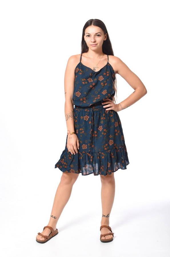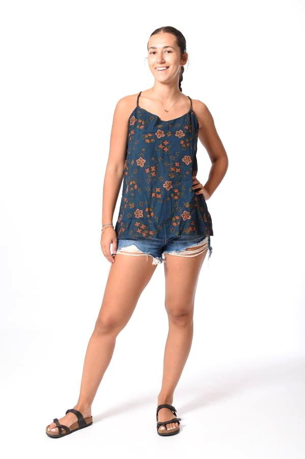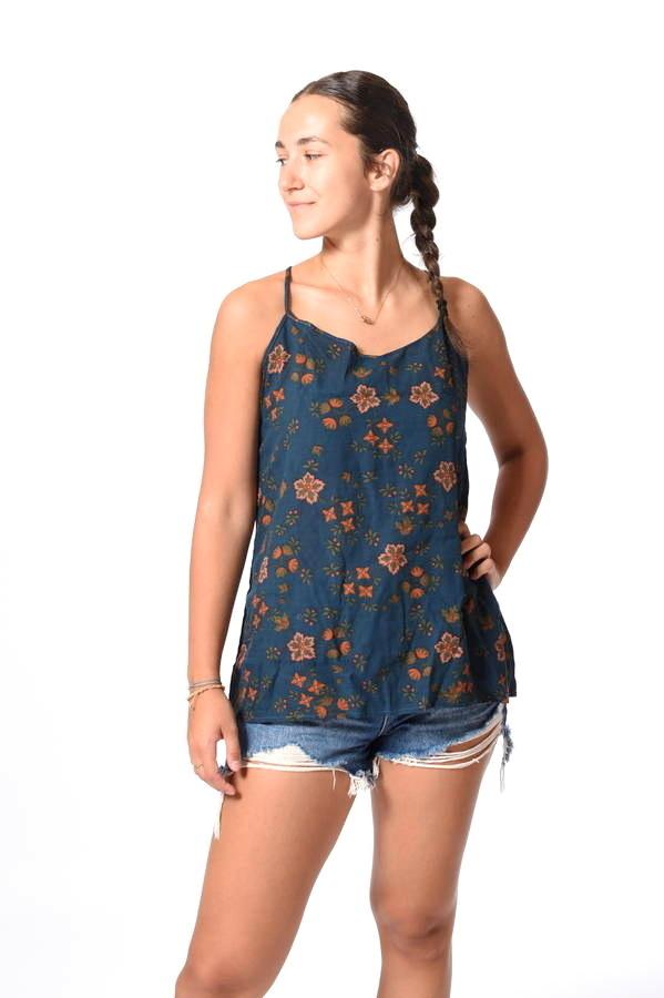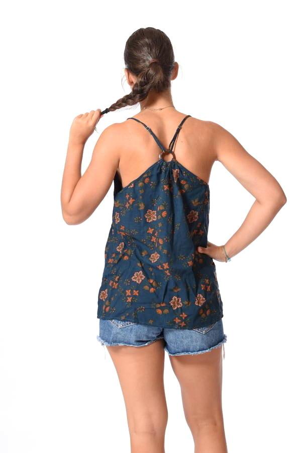 Dámske bavlnené boho tielko s tenkými nastaviteľnými ramienkami a dreveným krúžkom. Vzdušné a padavé tielko je celoplošne potlačené prírodným vzorom a je veľmi príjemné na kožu. Boho tielko je super na leto a je možné kombinovať ho so sukňou v tom istom dizajne.