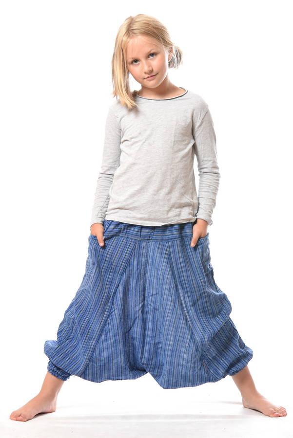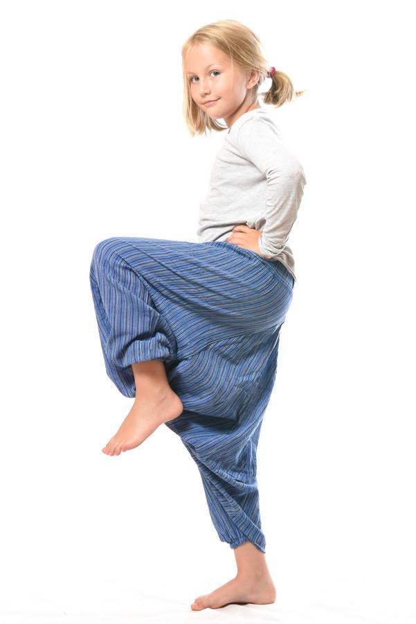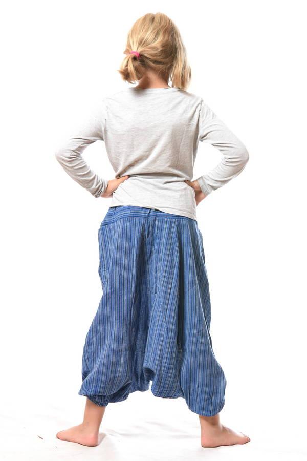 Pohodlné detské aladinky pre väčšie deti so sníženým pudlom. Aladinky dekorované pásikavým vzorom, majú 2 vrecká, strečový pás so šnúrkou na zatiahnutie a sťahovací patent na spodku nohavíc.
