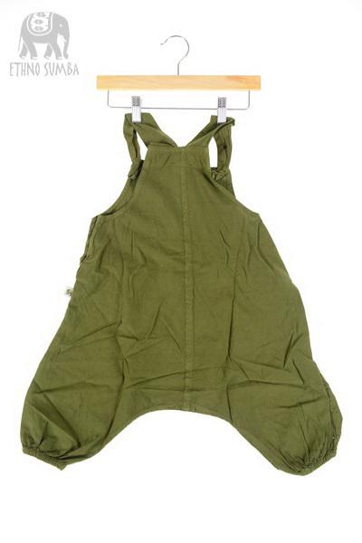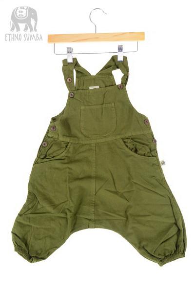 Pohodlný detský overal so sníženým pudlom. Detský etno overal má nastaviteľnú dĺžku trakov. Disponuje troma vreckami a patentom na spodku nohavíc.