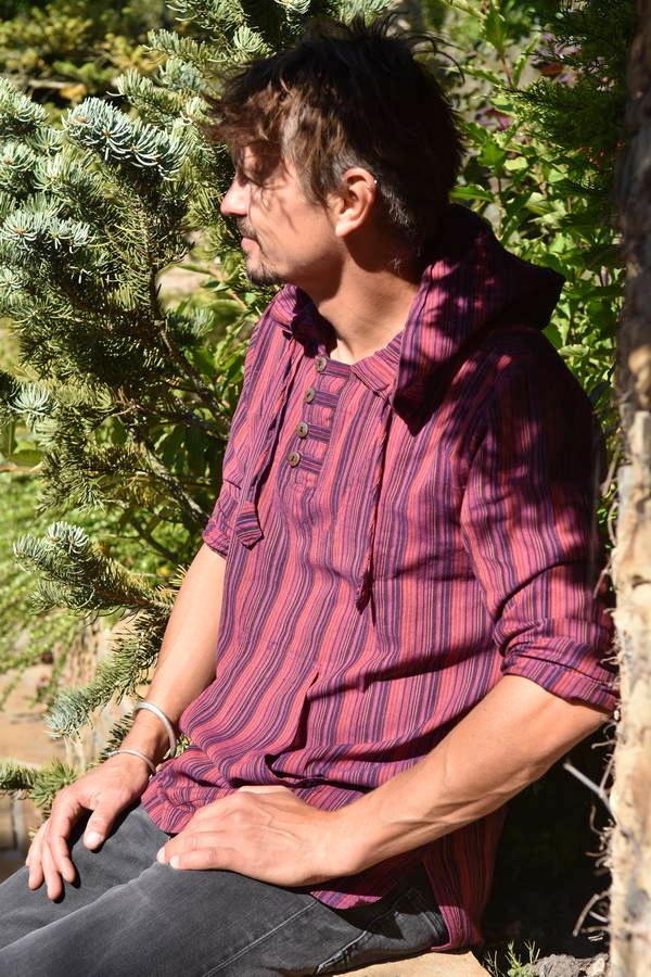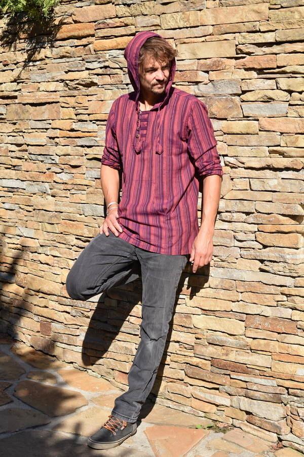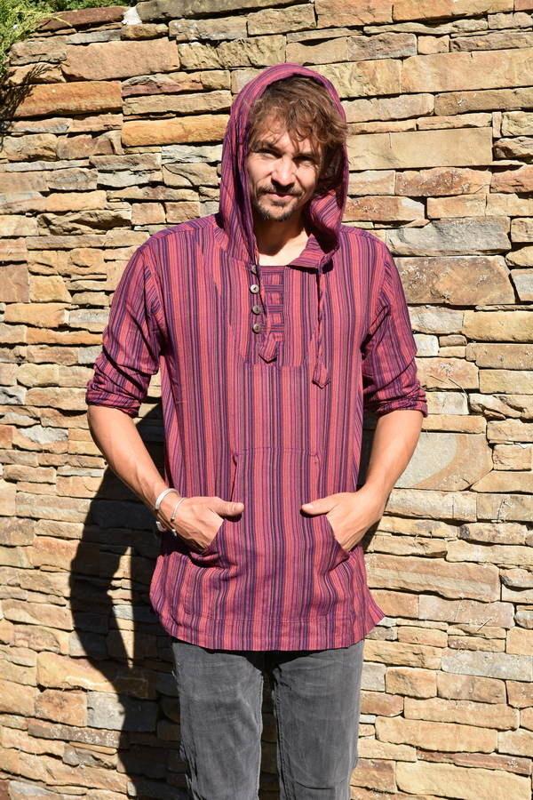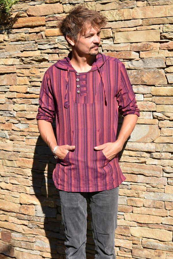 Pánska etno košeľa s kapucňou a vreckom na bruchu, vyrobená zo 100% bavlny. Veľmi pohodlný strih s dlhými rukávmi a zapínaním na gombíky pod krkom.